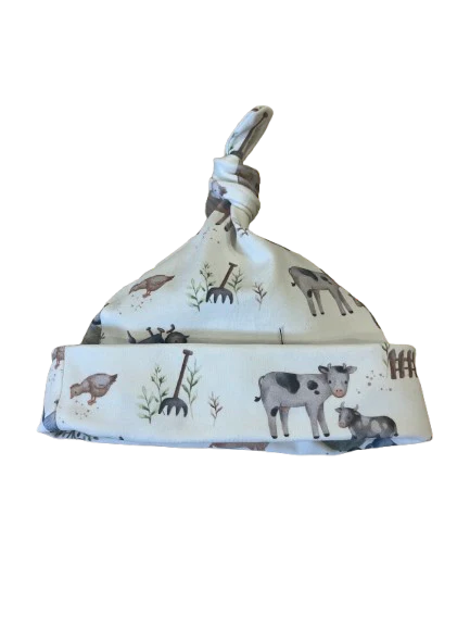 Chapeau ultra-doux et extensible Petit noeud ajustable 95% coton biologique et 5% spandex Bande qui se déroule pour s’ajuster à l’évolution de l’enfant 100% fabriqué au Québec S’agence bien avec toute la collections aux motifs de la ferme