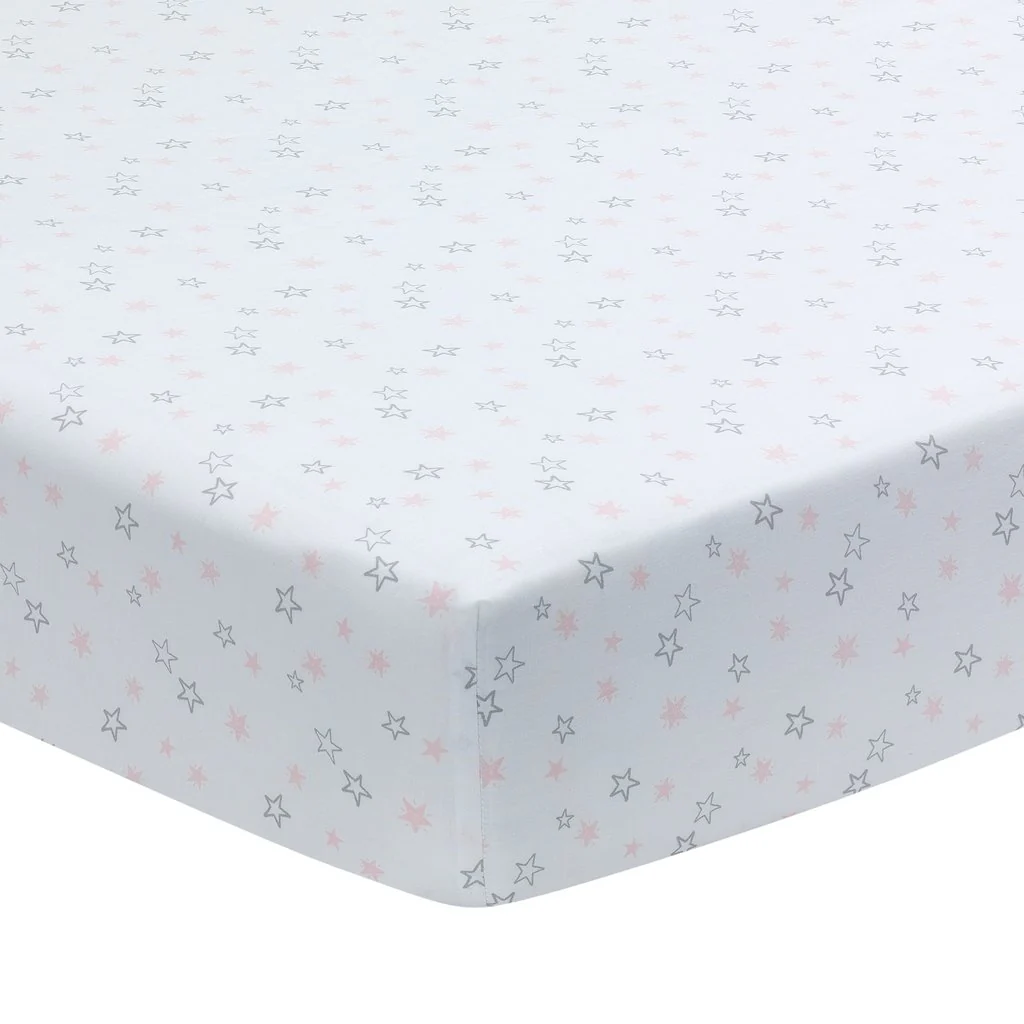 Drap contour – Swan Princess Dimensions : 71 x 133 cm (28 x 52 po) 100% coton Lavage et séchage à la machine Élastique tour autour pour maintenir le drap bien en place Motif d’étoiles grises et roses sur fond blanc. Fait partie de la collection Swan Princess de Lambs and Ivy