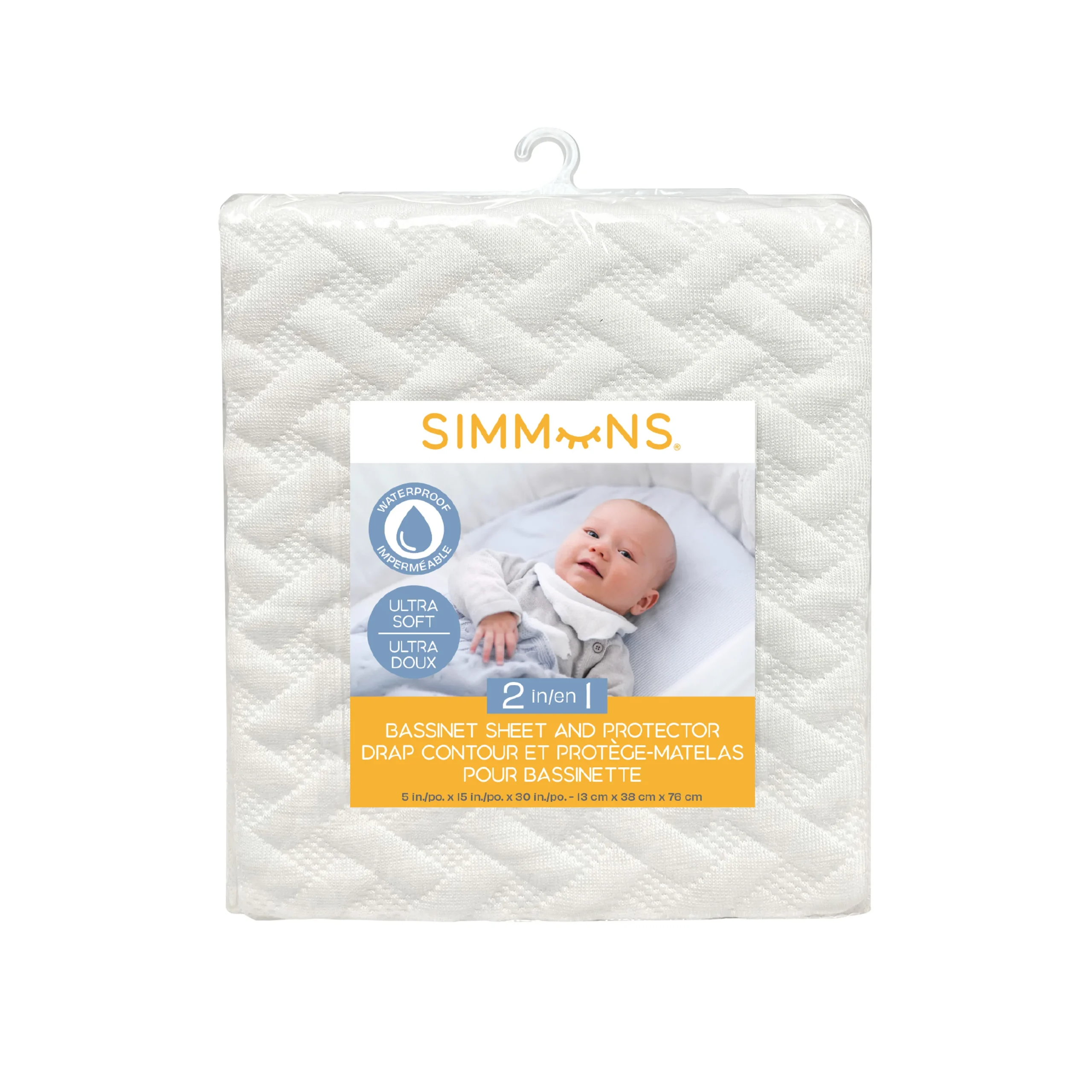 Drap et protège-matelas 2 en 1 pour bassinette – Ivoire Dessus, jupe et rembourrage : 100% polyester Couche intérieure: 78% Polyester / 22% Viscose de bambou Endos: Polyuréthane Imperméable Ajustement serré sécuritaire Laver et sécher à la machine 13 x 38 x 76 cm (5 x 15 x 30 po)