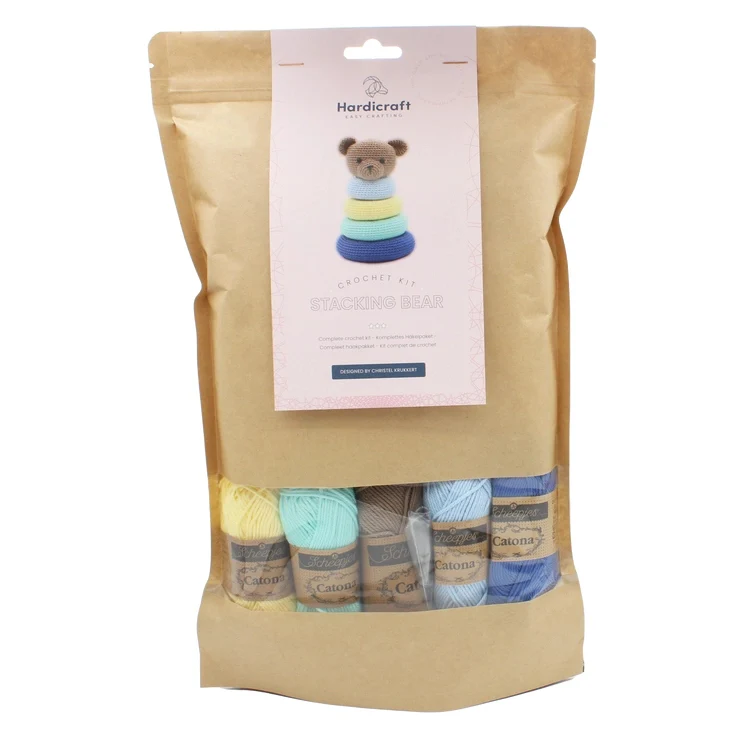 Ce paquet contient un patron (EN, NL, FR, DE), du fil 100 % coton de qualité et toute la mercerie nécessaire pour se mettre au travail (à l’exception du crochet). Le Stapelbeer mesure environ 18 cm de haut et est fabriqué avec un crochet de 2,5 mm.