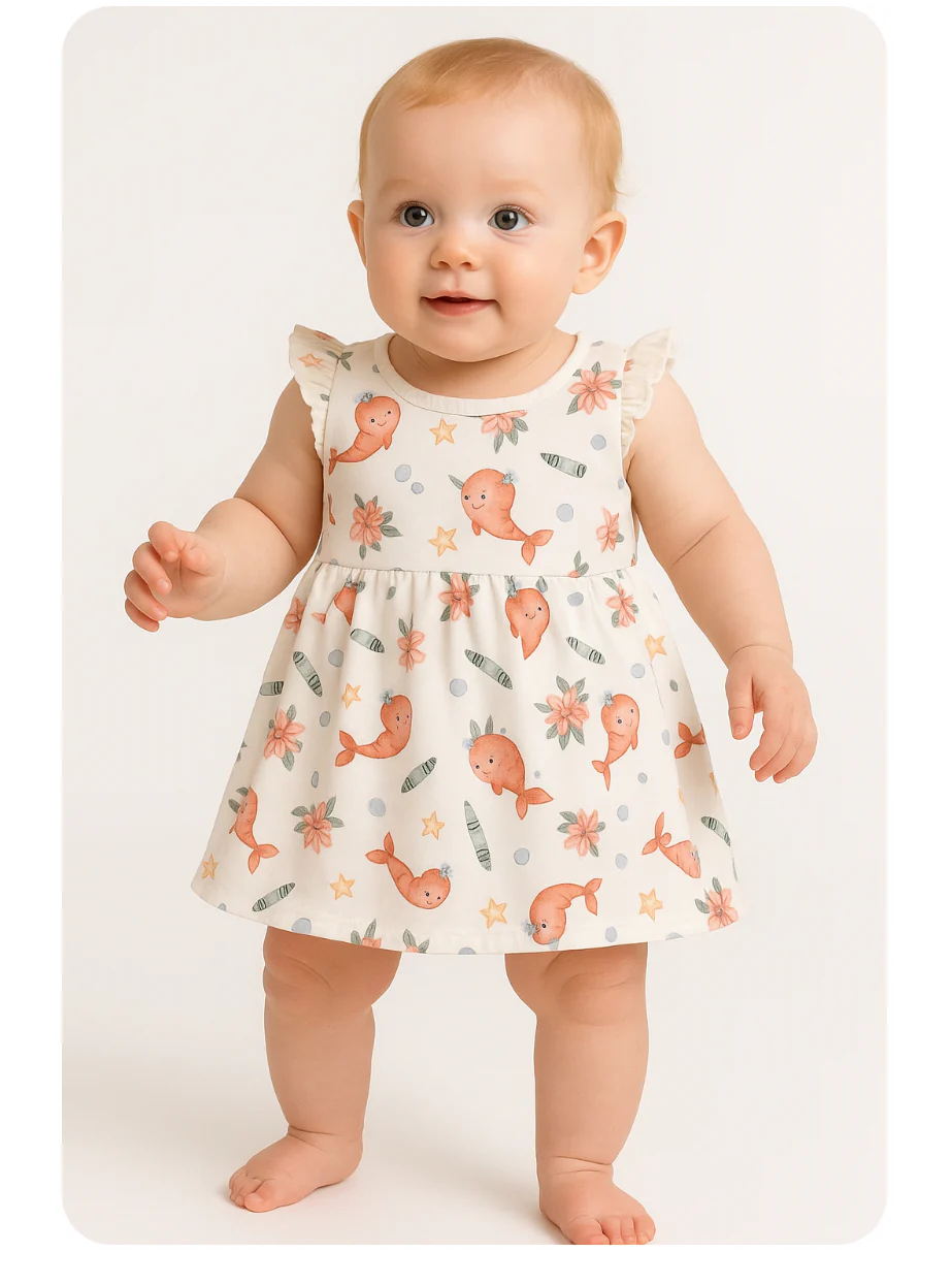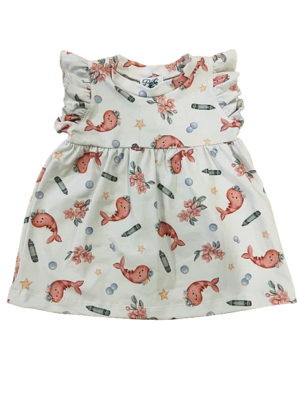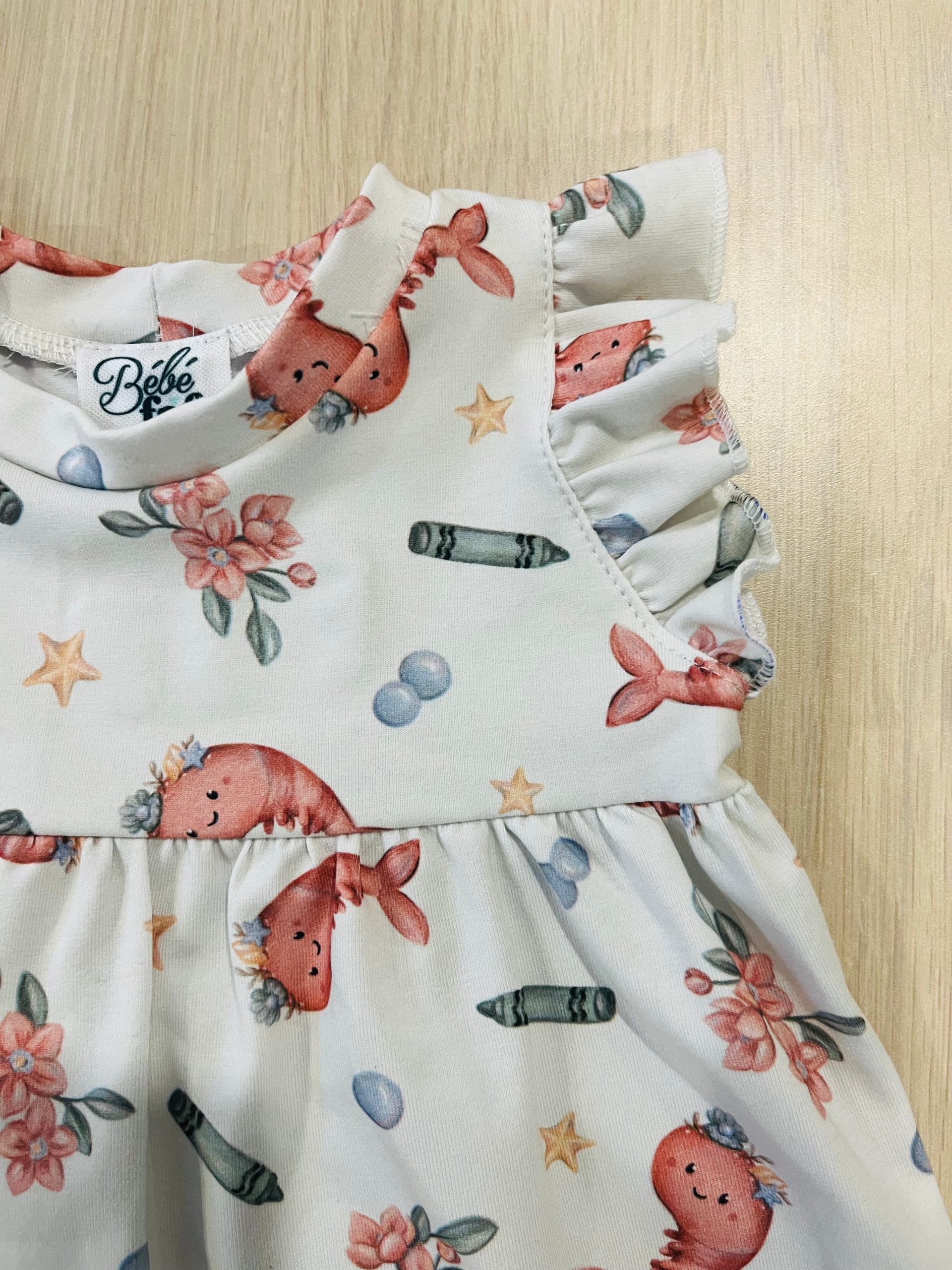 Petite robe toute confortable et extensible faite de coton et spandex extensible tout en confort. Elle enveloppera votre puce de douceur. Petits frisons légers Fabriquée au Québec Motifs de crevettes illustrés par l’artiste Marie-Anne Dubé Étiquette au col ultra léger et très doux pour les petits cous Parfaite pour les chaleurs estivales !