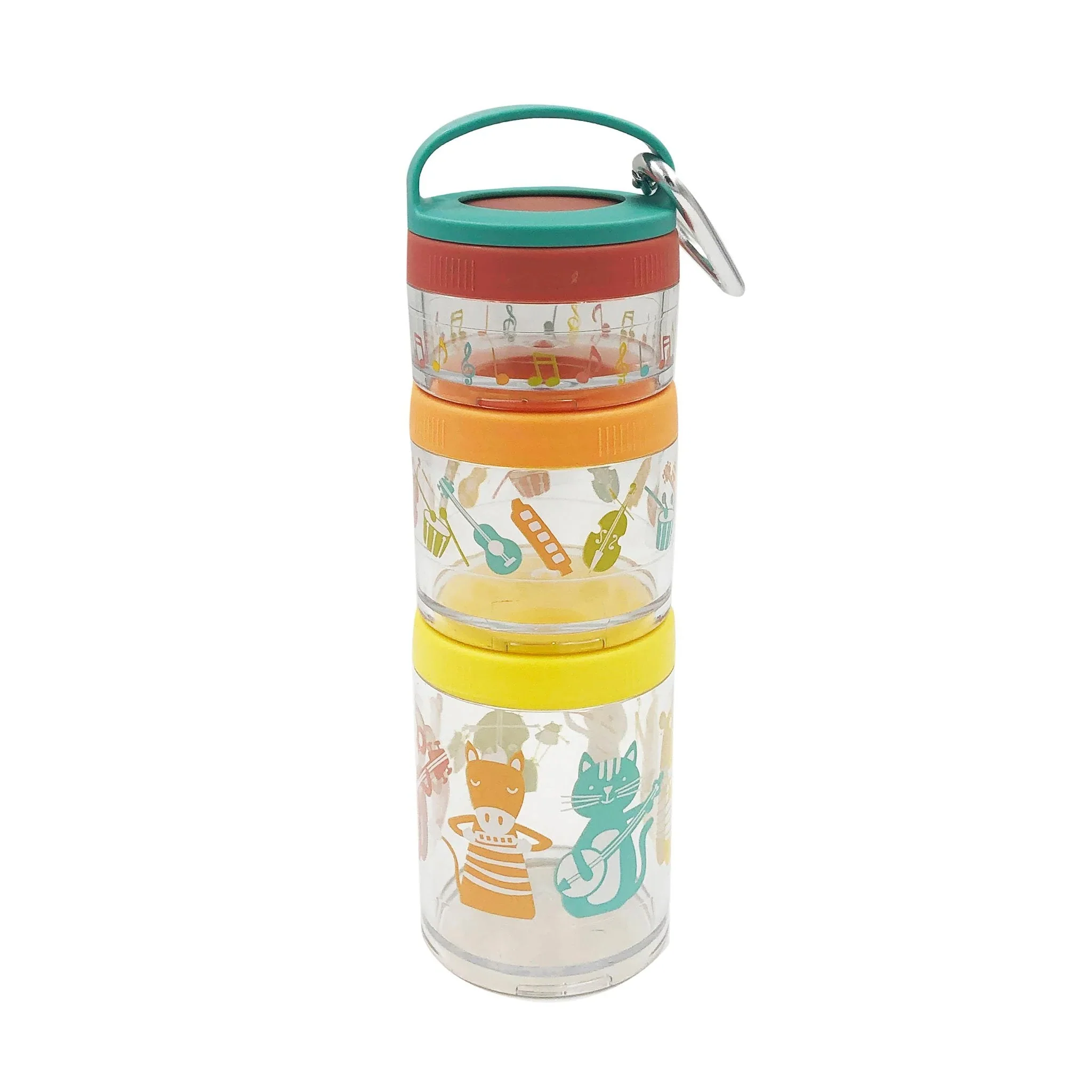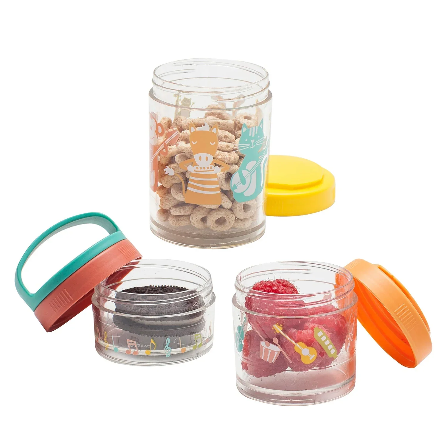 Twist and Snack – Animal Band Fait de Tritan et polypropylène Va au lave-vaisselle (panier suppérieur seulement) Conçu en Californie Fabriqué en Chine Dimension: 8″ X 2,25″ Petit contenant: 3.75 oz Moyen contenant: 4.25 oz Grand contenant: 7.85 oz Micro-onde sans les couvercles Sans BPA, Sans plomb, Sans phtalates, Sans PVC