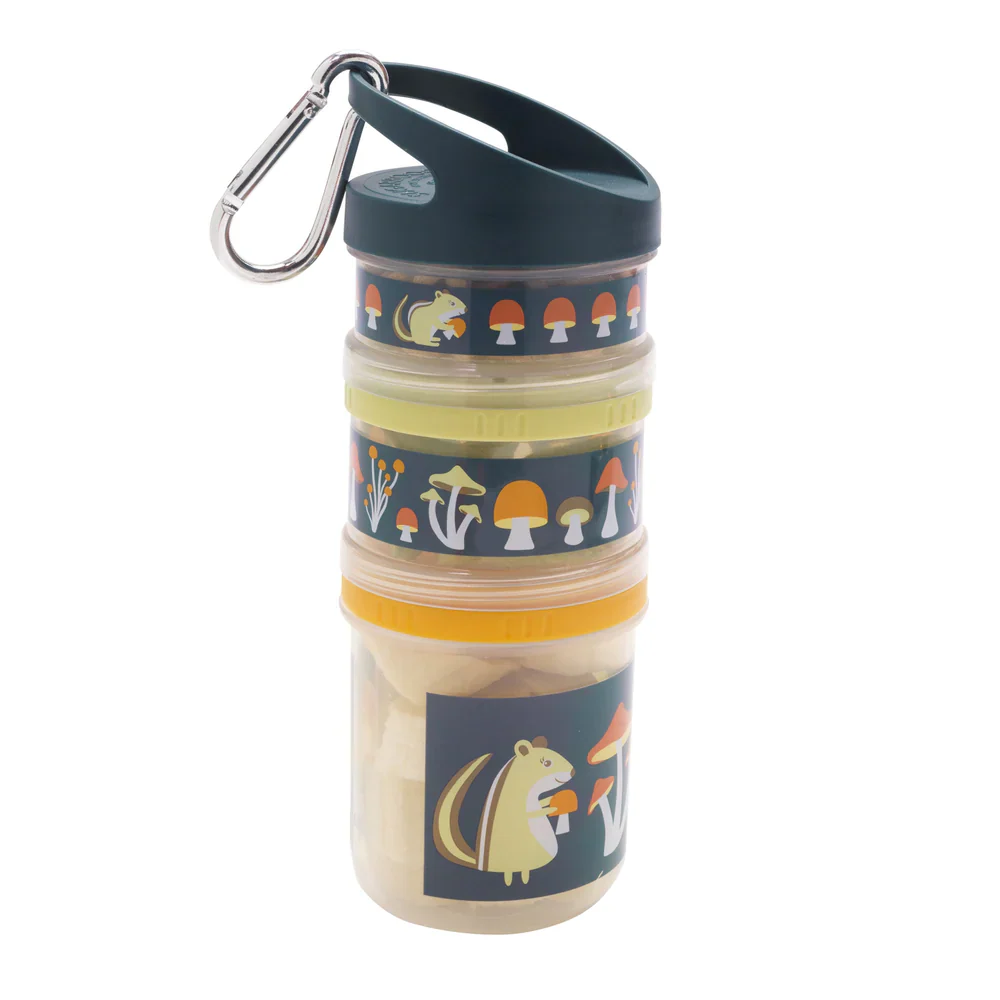 Twist and Snack – Mostly Mushrooms Fait de Tritan et polypropylène Va au lave-vaisselle (panier suppérieur seulement) Conçu en Californie Fabriqué en Chine Dimension: 8″ X 2,25″ Petit contenant: 3.75 oz Moyen contenant: 4.25 oz Grand contenant: 7.85 oz Micro-onde sans les couvercles Sans BPA, Sans plomb, Sans phtalates, Sans PVC