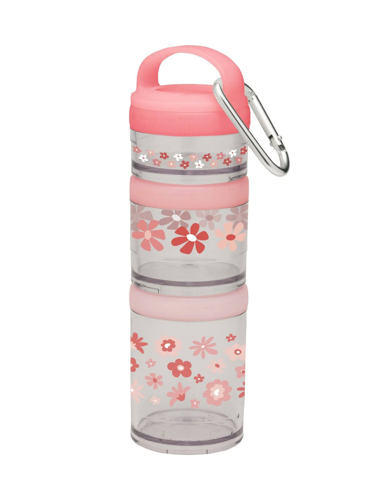 Dimension: 8″ X 2,25″ Petit contenant: 1/3 tasse Moyen contenant: 3,38 onces Grand contenant: 1/2 tasse Poignée amovible Mousquetons inclut et amovible Fait de Tritan Couvercle en polypropylène Va au lave-vaisselle (panier suppérieur seulement) Micro-onde sans les couvercles Sans BPA Sans plomb Sans phtalates Sans PVC